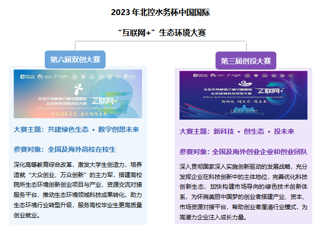 目前,北控水務杯第六屆中國國際“互聯網+”生態環境創新創業大賽(以下簡稱“雙創大賽”)和第三屆中國國際“互聯網+”生態環境科技創投大賽(以下簡稱“創投大賽”)兩場賽事報名通道已在北控水務集團官網(http://www.bewg.net/)正式開啟,報名截止日期為2023年10月10日,并擬定于12月初在南京大學舉辦現場總決賽。