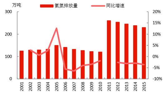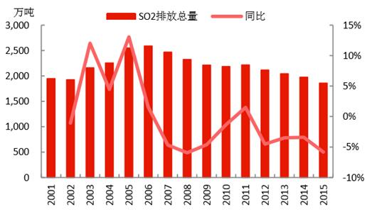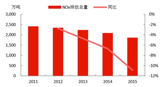 經過“十二五”的治理,四項污染物減排約束性指標均實現了持續下降,完成了“十二五”的減排任務,取得了一定的環保成果。2015年:1)COD的排放量為2224萬噸,且每年以3%左右的速度下降;2)氨氮的排放量為230萬噸,且每年以3%左右的速度下降;3)SO2的排放量為1859萬噸,每年基本以4%左右的速度下降,而收關年2015年下降速度高達5.84%;4)NOx的排放量為1852萬噸,“十二五”剛開始治理,當前的下降速度還處于上升趨勢,收關年2015年下降速度高達10.89%。