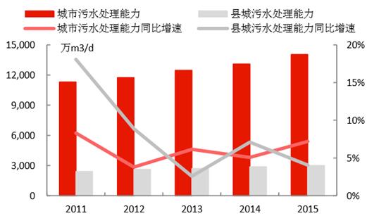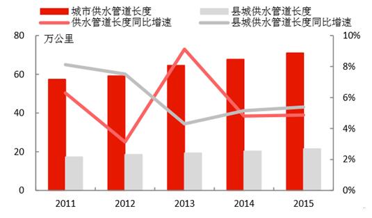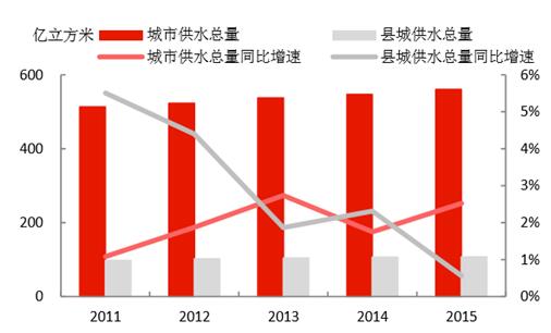 城鎮化的推進,為水務行業持續帶來增量空間。1)我國城鎮人口2015年達到7.71億,近年城鎮人口增速維持在3%左右;城市建成區面積2015年達到5.21萬平方公里,近年面積增速維持在4-5%。2)城市供水總量在2015年達到561億立方米,同比增速為2.5%;縣城的供水量達106.9億立方米,增速有所下降,僅為0.56%。3)城市供水管網長度在2015年達到71.0萬公里,同比增速為4.87%;縣城的供水管網長度為21.5萬公里,同比增速達5.39%;通過管網建設,是的用水普及率持續提升,城市和縣城2015年的用水普及率分別為98.1%和90.0%。4)城市污水處理能力在2015年達到1.40億立方米/日,同比增長7.19%;縣城達到2999萬立方米/日,同比增長了4.06%,城市和縣城的污水處理率分別達到91.9%和85.2%,較2010年分別提升了9.6和25.1個百分點。