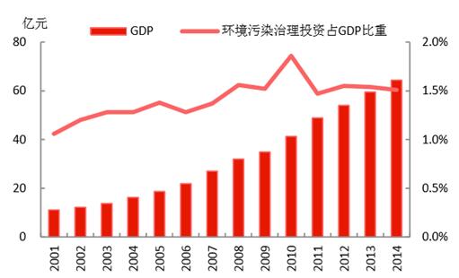 從國家統計局的數據可以看到,我國在環境污染治理方面的投資量,呈現上升趨勢,2014年達到9576億元;近年占GPD的比重維持在1.5%左右,較2001年提升約0.5個百分點。發改委、環保部印發《關于培育環境治理和生態保護市場主體的意見》,提出目標,“十三五”綠色環保產業產值年均增長15%以上,遠高于CDP的增長目標,為經濟增長注入動力。