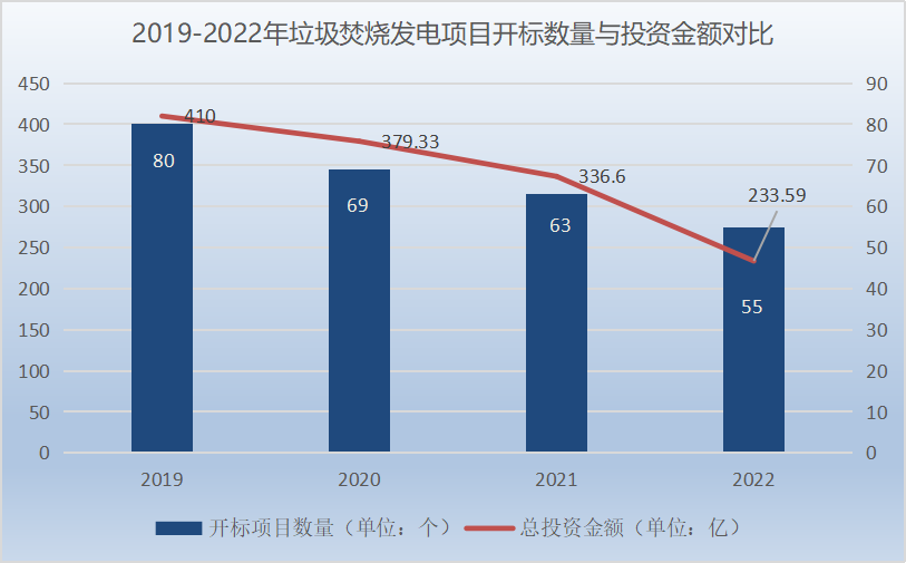垃圾焚燒發電行業在歷經“跑馬圈地”、“搶裝潮”等時期后,進入冷靜發展期。北極星固廢網統計了2019年-2022年的垃圾焚燒發電項目開標數量以及投資總額,整體呈逐年下滑趨勢。