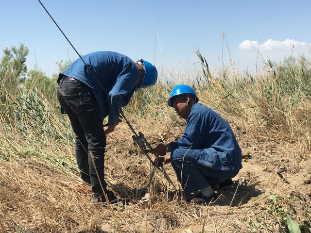 該公司員工排查10千伏線路拉線隱患。(李新疆 攝)