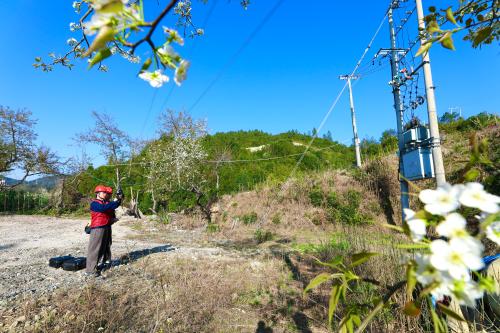 在這如詩如畫的梨山花海中,頭戴安全帽,身著國網福建電力“雙滿意”(壽寧閩東之光)共產黨員服務隊“紅馬甲”的身影格外引人注目,他們手持紅外測溫儀,穿梭在雪白的梨花的小徑上,成為一道獨特的風景。巡視過程中,他們仔細地對10kV浦南線進行檢查,每一個接頭、每一臺變壓器,都是他們關注的重點。與此同時,無人機也在梨山上空盤旋,從高空視角對線路進行全方位巡查。通過無人機搭載的高清攝像頭,工作人員可以清晰地看到線路是否存在安全隱患,大大提高了巡檢效率和準確性。