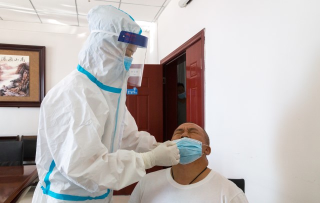 此次核酸檢測方式為鼻咽拭子。該院體檢中心主任孫逾介紹,人體咽部分區包括鼻咽、口咽、喉咽,三者的黏膜是連續的,均屬于上呼吸道區域。采用鼻咽拭子取樣時,棉簽可以在咽部停留較長的時間,操作者不需直視患者口腔,暴露風險低。接受檢測人員下拉口罩僅露出鼻孔,基本不出現咽反射,能夠獲得足量的采集標本,有助于提高核酸檢測的準確率。