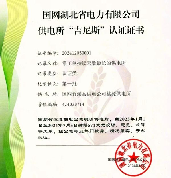 中國電力網訊(通訊員 黃耀成、郭旭) 日前,從國網湖北省電力有限公司傳來喜訊,繼去年國網竹溪縣供電公司匯灣供電所喜獲國網十堰供電公司“四星級鄉鎮供電所”授牌后,今年國網竹溪縣供電公司桃源供電所又獲國網湖北省電力有限公司頒發的零工單位持續天數最長的供電所“吉尼斯”認證證書,這是該公司強化從業紀律,擦亮服務窗口,電業清風為民的真實寫照。
