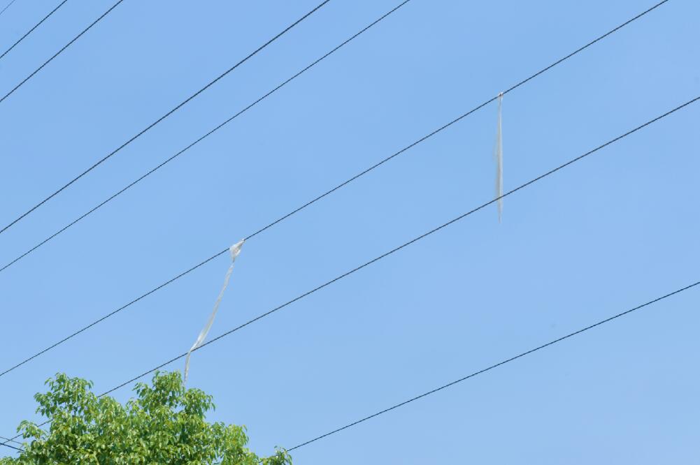中國電力網(wǎng)訊 8月14日下午,國網(wǎng)余姚市供電公司公司輸配電運檢中心員工巡視線路時發(fā)現(xiàn),在陸埠鎮(zhèn)工業(yè)園區(qū)35千伏洲車3825線23至24號塔之間的線路上有兩股異物纏繞,一旦連接兩根導(dǎo)線,極易引發(fā)線路跳閘,危及電網(wǎng)安全穩(wěn)定運行。