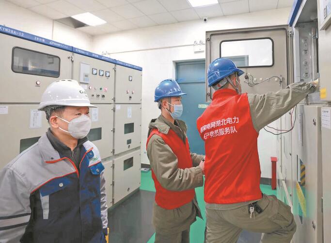 湖北鄂州供電公司黨員突擊隊隊員幫助企業測量低壓配電柜內電壓。戴佩 攝