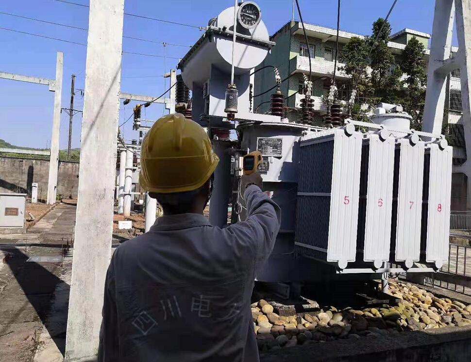 8月1日,國網南充市高坪供電公司工作人員對35千伏安平變電站主變特巡測溫。(何光雄 攝)