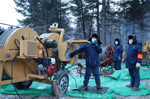 牽引機(jī)、電纜軸快速轉(zhuǎn)動(dòng),粗實(shí)的導(dǎo)線順著前方的鐵塔上的滑輪緩緩回收,導(dǎo)地線展放、張力緊線、附件安裝、導(dǎo)線壓接……冬季的寒風(fēng)刺骨,施工人員顧不上寒冷,加緊施工。