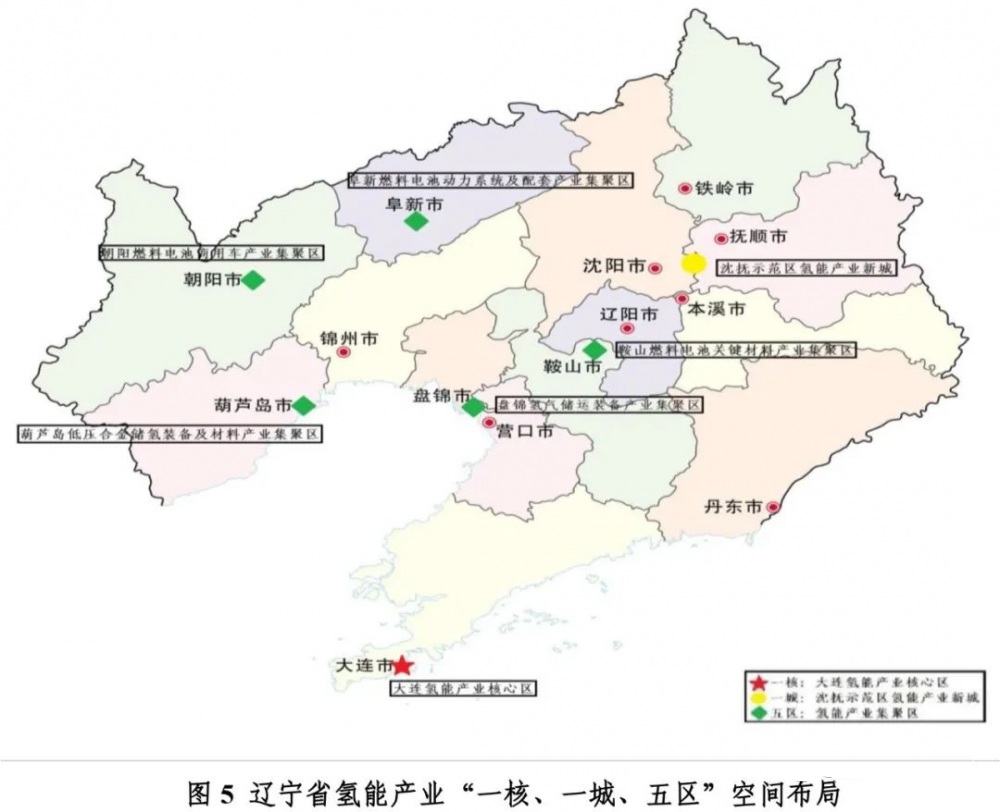 根據(jù)遼寧省現(xiàn)有氫能產(chǎn)業(yè)發(fā)展基礎,以“合理集聚、產(chǎn)業(yè)協(xié)同、政企聯(lián)動、互為支撐”為原則進行空間布局和優(yōu)化,著力構(gòu)建“一核、一城、五區(qū)”的氫能產(chǎn)業(yè)空間發(fā)展格局。