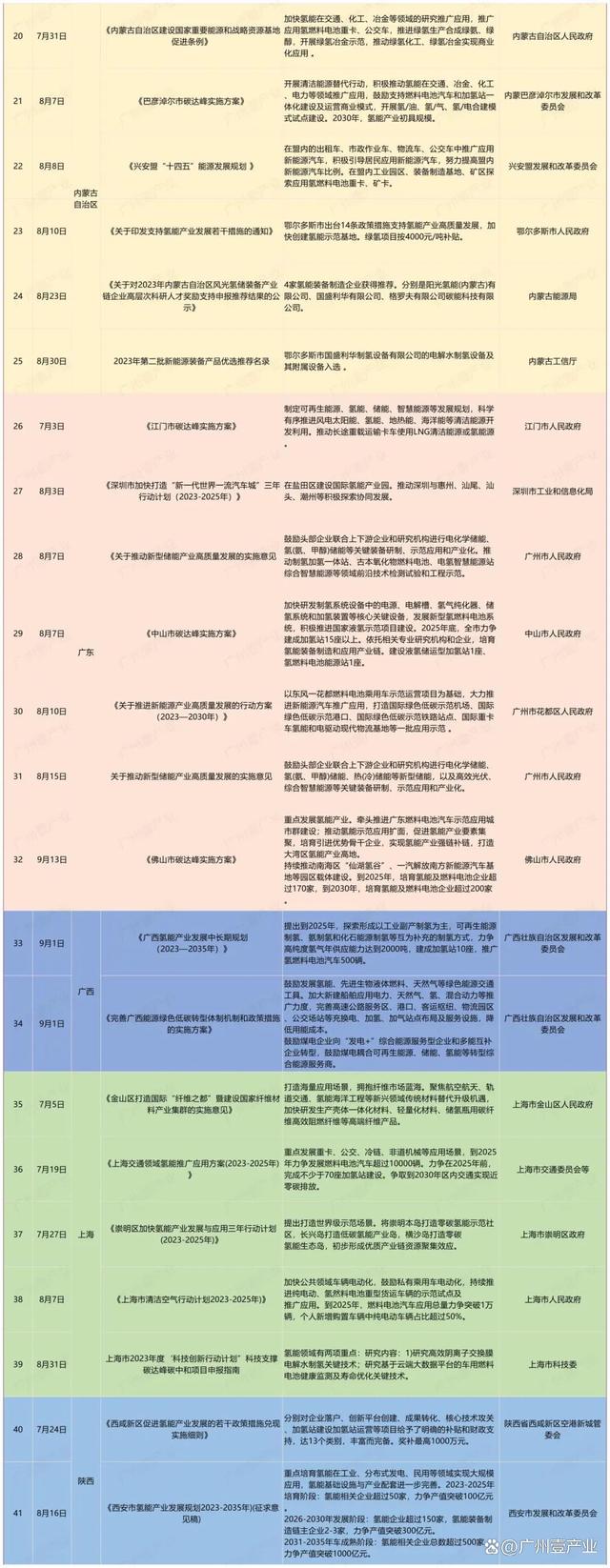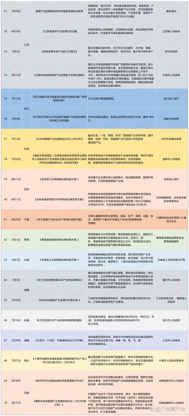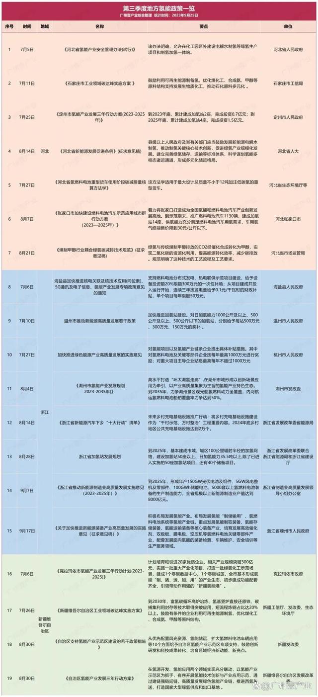 9月17日,浙江省嵊州市人民政府發(fā)布了《關(guān)于加快推進(jìn)新能源裝備產(chǎn)業(yè)高質(zhì)量發(fā)展的實(shí)施意見(jiàn)(征求意見(jiàn)稿)》。其中提到,積極布局發(fā)展氫能產(chǎn)業(yè)。布局發(fā)展氫能“制儲(chǔ)輸用”、氫燃料電池系統(tǒng)等氫能產(chǎn)業(yè)鏈。9月14日,山東省能源局發(fā)布了《關(guān)于開(kāi)展能源綠色低碳轉(zhuǎn)型試點(diǎn)示范建設(shè)工作的通知》。文件中涉及到氫能的內(nèi)容有:鼓勵(lì)發(fā)展風(fēng)電、光伏發(fā)電制氫,培育可再生能源開(kāi)發(fā)利用新模式新業(yè)態(tài);積極推進(jìn)核能海水淡化、核能制氫等研究示范等。9月13日,佛山市人民政府印發(fā)了《佛山市碳達(dá)峰實(shí)施方案》的通知。方案中提到,重點(diǎn)發(fā)展氫能產(chǎn)業(yè)。牽頭推進(jìn)廣東燃料電池汽車示范應(yīng)用城市群建設(shè),強(qiáng)化城市群內(nèi)各市資源共享、優(yōu)勢(shì)互補(bǔ)。加強(qiáng)氫能基礎(chǔ)設(shè)施建設(shè)。推動(dòng)氫能示范應(yīng)用擴(kuò)面,促進(jìn)氫能產(chǎn)業(yè)要素集聚,培育引進(jìn)優(yōu)勢(shì)骨干企業(yè),實(shí)現(xiàn)氫能產(chǎn)業(yè)強(qiáng)鏈補(bǔ)鏈,打造大灣區(qū)氫能產(chǎn)業(yè)高地。持續(xù)推動(dòng)南海區(qū)“仙湖氫谷”、一汽解放南方新能源汽車基地等園區(qū)載體建設(shè)。到2025年,培育氫能及燃料電池企業(yè)超過(guò)170家,到2030年,培育氫能及燃料電池企業(yè)超過(guò)200家。......據(jù)廣州壹產(chǎn)業(yè)不完全統(tǒng)計(jì),截至9月25日,今年第三季度(7、8、9月),部委共發(fā)布15條與氫能相關(guān)的政策,地方則有23個(gè)省(市)發(fā)布了70條氫能政策,合計(jì)85條。