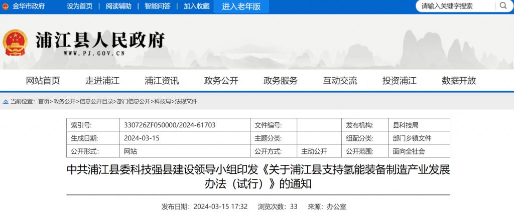 關于浦江縣支持氫能裝備制造產業發展辦法(試行)