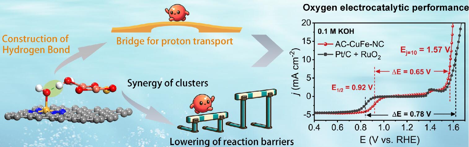 基于此,研究工作2報道了一種原子全暴露的Fe摻雜的CuO團(tuán)簇與單原子位點(diǎn)協(xié)同的新型催化劑。實(shí)驗(yàn)和DFT計算表明:一方面,協(xié)同的Cu-O-Fe 團(tuán)簇能有效誘導(dǎo)鐵單原子位點(diǎn)的電子結(jié)構(gòu)重新分布、調(diào)節(jié)氧吸附能并降低 ORR 勢壘;另一方面,譜學(xué)表征和理論計算表明Cu-O-Fe團(tuán)簇協(xié)同構(gòu)建了含氧反應(yīng)中間體與電解質(zhì)分子之間的氫鍵,所構(gòu)建的氫鍵不僅可以穩(wěn)定含氧反應(yīng)中間體,同時拉伸了ORR最后一步的Fe-O鍵長,有助于OH*的脫附;更為質(zhì)子傳輸提供了通道,提高了反應(yīng)動力學(xué)。這項(xiàng)研究中展示的新穎的催化劑結(jié)構(gòu)和協(xié)同機(jī)制,為開發(fā)綠色能源轉(zhuǎn)換裝置中的高性能催化劑提供了新的視角和參考。