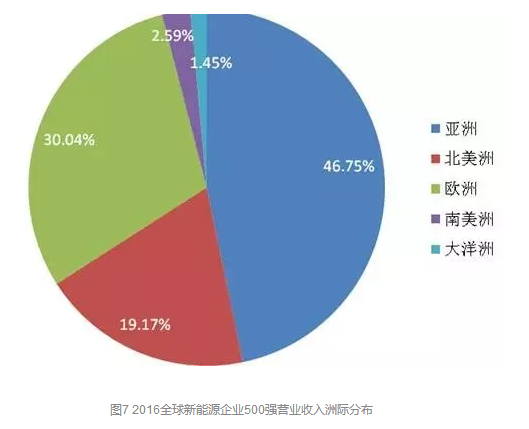 自2015全球新能源企業“500強”亞洲首次在入圍的企業數和其總營業收入額上全面超越歐洲后,今年亞洲在的企業數和其總營業收入額上拉大了與歐洲的差距,優勢擴大。
