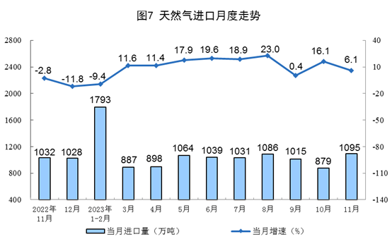 1—11月份,生產天然氣2096億立方米,同比增長6.0%。進口天然氣10740萬噸,同比增長8.5%。
