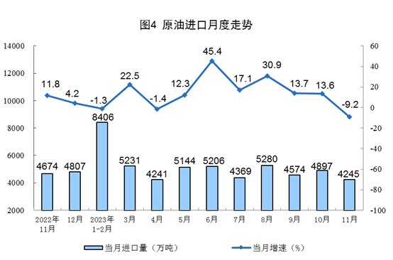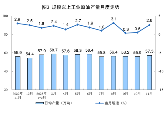 原油生產增速加快,進口增速由增轉降。11月份,生產原油1720萬噸,同比增長2.6%,增速比10月份加快2.1個百分點,日均產量57.3萬噸。進口原油4245萬噸,同比下降9.2%,10月份為增長13.6%。