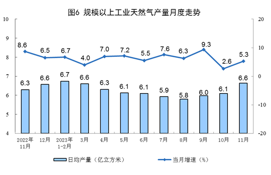 天然氣生產增速加快,進口穩定增長。11月份,生產天然氣199億立方米,同比增長5.3%,增速比10月份加快2.7個百分點,日均產量6.6億立方米。進口天然氣1095萬噸,同比增長6.1%,增速比10月份回落10.0個百分點。