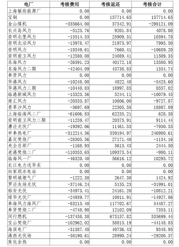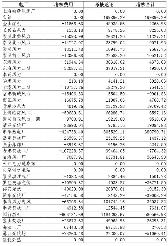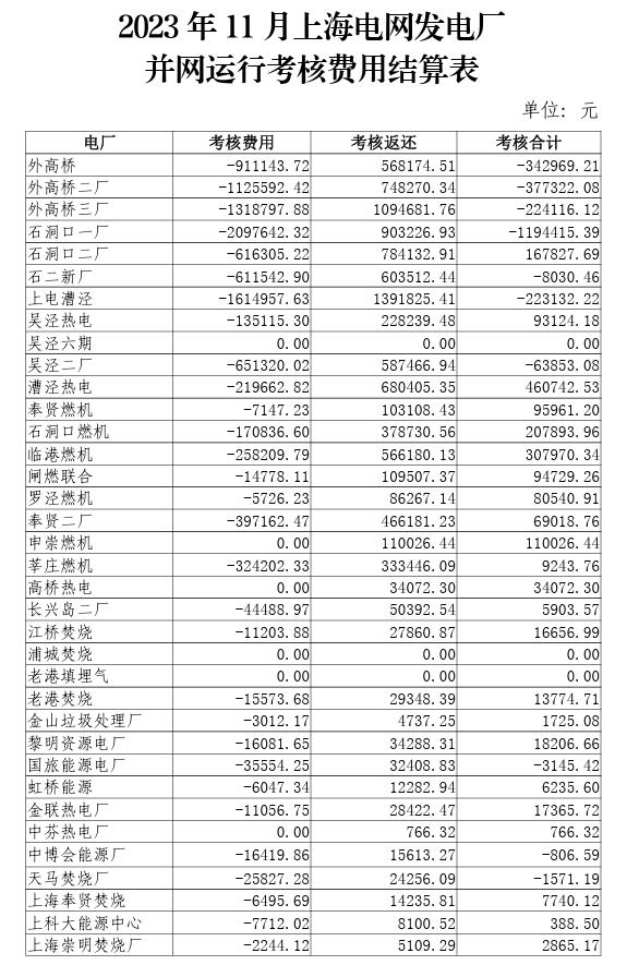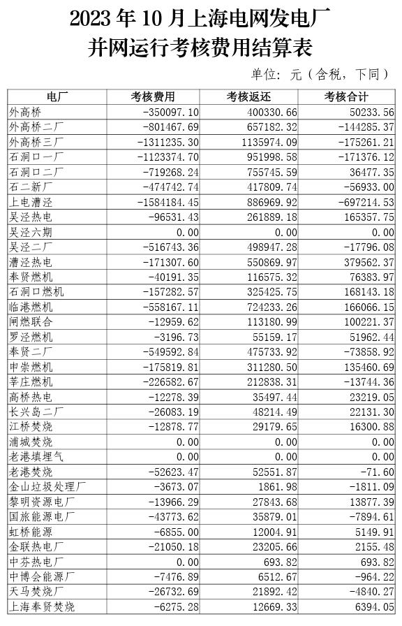 2023年10-12月上海電網發(fā)電廠并網運行考核費用結算表