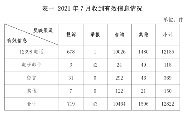 2021年7月,國家能源局12398能源監管熱線(以下簡稱12398熱線)共收到有效信息12822件(包含投訴、舉報、咨詢和其他訴求類別),環比增加29.52%,同比增加11.58%。(2021年7月收到有效信息情況見表一)