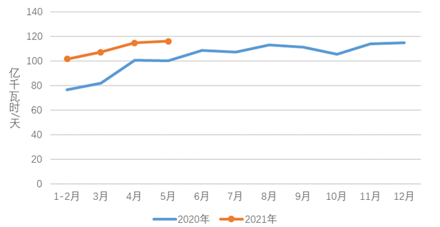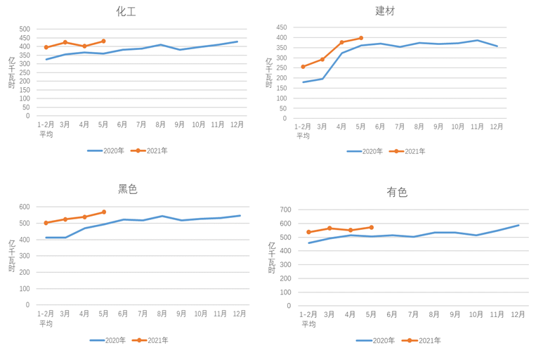 1-5月,化工行業(yè)用電量2048億千瓦時,同比增長12.8%,增速比上年同期提高17.0個百分點;建材行業(yè)用電量1580億千瓦時,同比增長24.4%,增速比上年同期提高31.8個百分點;黑色金屬冶煉行業(yè)用電量2639億千瓦時,同比增長18.3%,增速比上年同期提高19.8個百分點;有色金屬冶煉行業(yè)用電量2763億千瓦時,同比增長10.2%,增速比上年同期提高8.2個百分點。