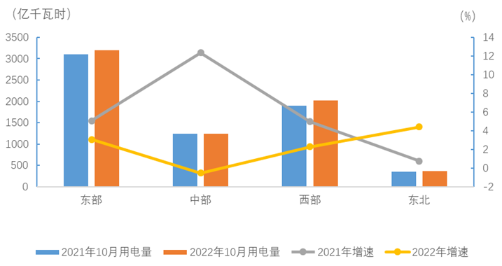 1-10月,東、中、西部和東北地區②全社會用電量分別為33578、13779、20700和3702億千瓦時,增速分別為2.5%、7.5%、4.2%和0.6%。