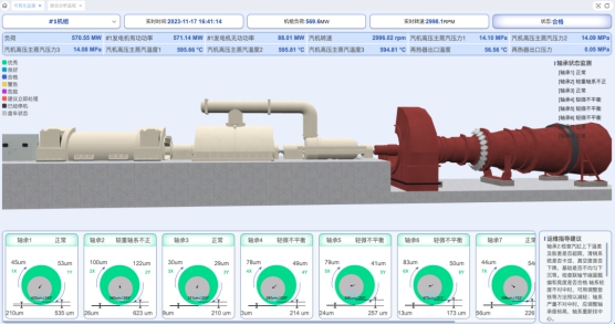 (兩張)圖注:系統(tǒng)主機首頁可集中顯示汽輪發(fā)電機組/輔機運行狀態(tài),實時監(jiān)視軸承振動水平、重要參數(shù)的變化情況