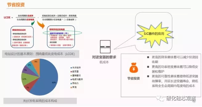 實際上,在光伏發(fā)電的系統當中,硅基的逆變器的成本占到系統的10%左右,但它卻是系統損耗的一個主要來源。如果通過使用碳化硅功率模塊的光伏逆變器,系統的轉化效率可以從96%提升到99%以上,能量損耗能夠降低50%以上,能夠顯著的提高循環(huán)設備的使用壽命,能夠降低系統的體積,增加功率密度,從而降低生產成本。