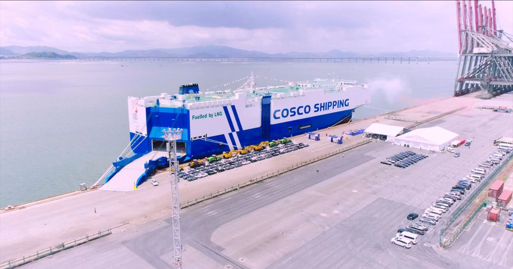 近日,伴隨著響亮的汽笛聲,中國遠洋海運運營的首批7500車位液化天然氣雙燃料新型汽車船命名首航,標志著中國汽車遠洋運輸船隊正式駛入“大船時代”、“新能源時代”。一輛輛嶄新的商品車從碼頭前沿緩緩開上新船尾跳,新船“遼河口”輪將搭載5000余輛來自北汽、柳汽、比亞迪、奇瑞等品牌的商品車開啟歐洲航程;與此同時,其姊妹船“閩江口”輪在上海完成裝船作業(yè)后也將搭載4800余輛商品車前往波灣。