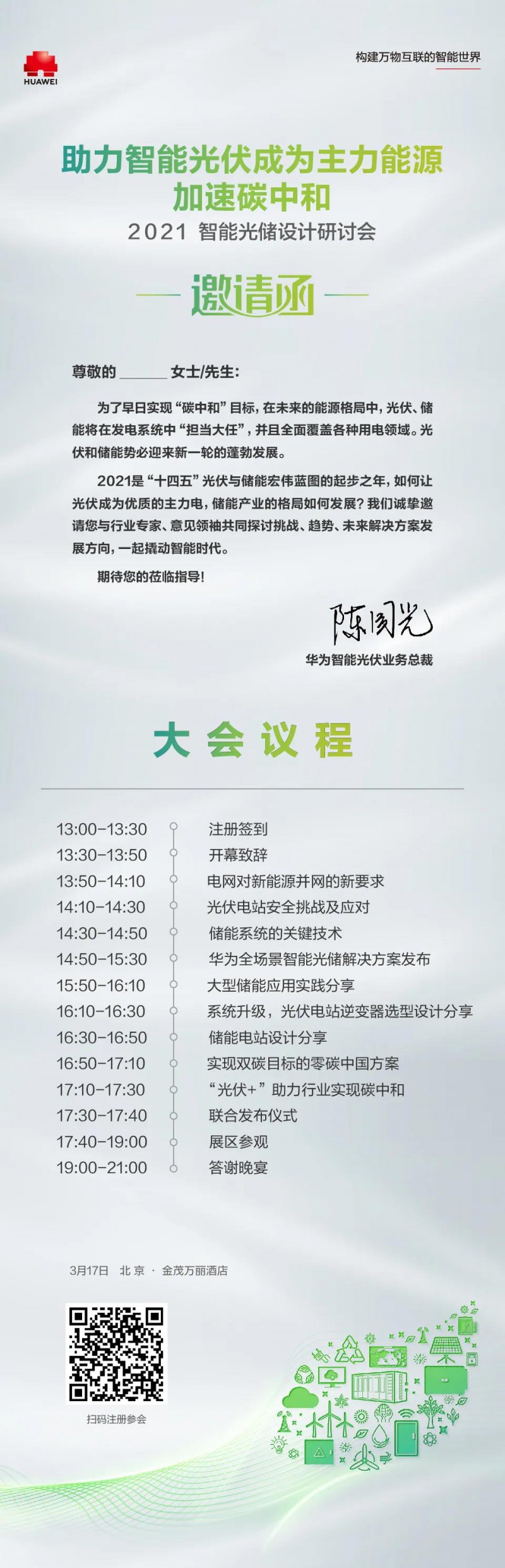 2021是“十四五”光伏與儲能宏偉藍圖的起步之年,讓光伏發電可儲可控,已成為能源轉型的必然選擇。如何助力智能光伏成為主力能源,促進儲能、光伏產業協同良性發展,是實現我國碳中和目標的重中之重。為了盡快迎接零碳時代的到來,3月17日,2021智能光儲設計研討會即將在北京舉辦,掃描圖片下方二維碼即可報名參會!