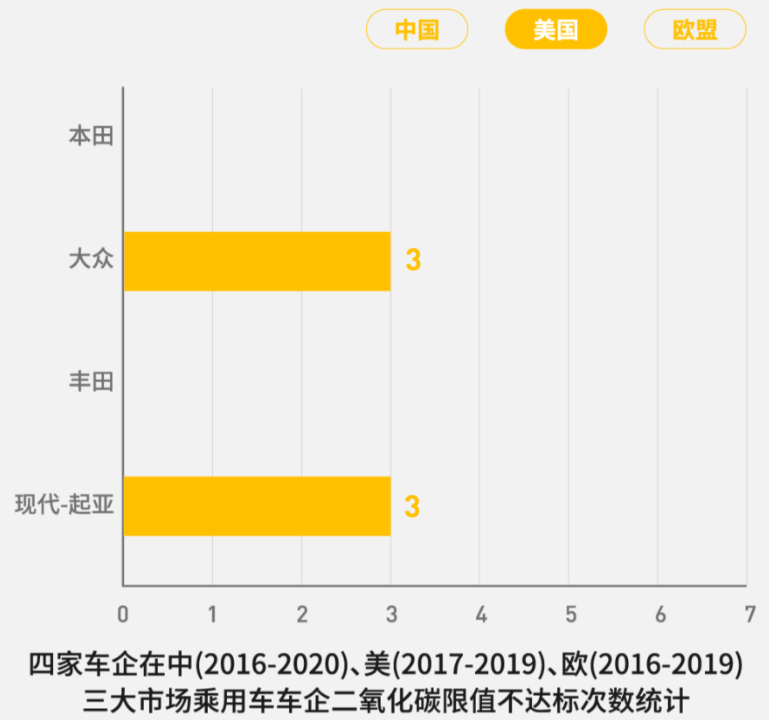 報告數據顯示,2016-2020年間,四家車企在中國均至少有兩次不達標,其中豐田五次不達標,本田與現代-起亞三次不達標,大眾則有兩次。