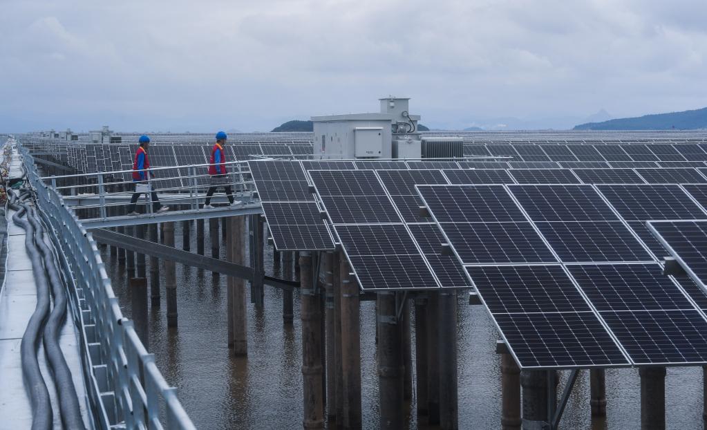 6月29日,國網浙江象山縣供電公司工作人員正在巡檢象山長大涂灘涂光伏設備。新華社記者 徐昱 攝