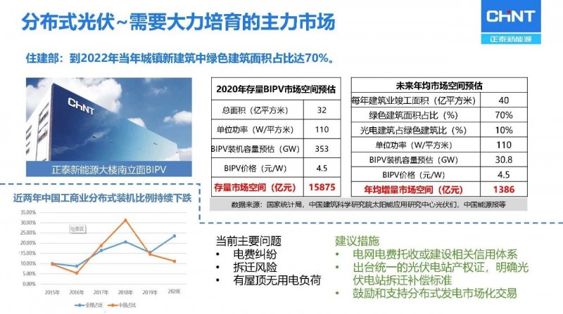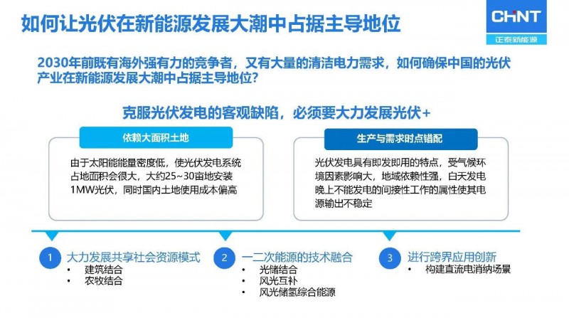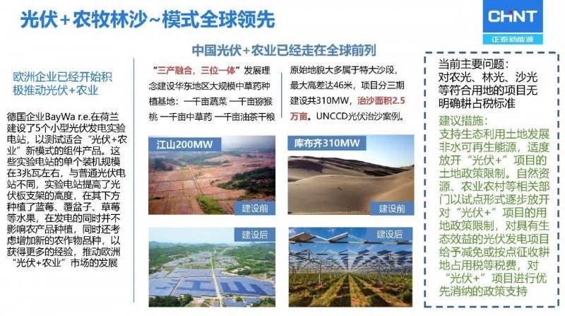 2021年2月3日,由中國光伏行業(yè)協(xié)會(huì)主辦的“光伏行業(yè)2020年發(fā)展回顧與2021年形勢展望網(wǎng)絡(luò)研討會(huì)”上,浙江正泰新能源開發(fā)有限公司總裁陸川針對(duì)我國目前光伏+融合發(fā)展模式趨勢進(jìn)行了分析。我國已經(jīng)走在了全球光伏+農(nóng)業(yè)行業(yè)的前列,針對(duì)農(nóng)光互補(bǔ)電站,他希望能夠推動(dòng)自上而下的關(guān)于農(nóng)光互補(bǔ)設(shè)施正常補(bǔ)償機(jī)制的兌現(xiàn)以促進(jìn)行業(yè)更優(yōu)發(fā)展。光伏+海漁的合作方式適用于我國東南海岸,克服了東部土地緊張,不但能夠產(chǎn)生發(fā)電效益,同時(shí)還能產(chǎn)生漁業(yè)收益。光伏+儲(chǔ)能、光伏+風(fēng)電、光伏+制氫等均為我國光伏應(yīng)用新模式做出突出貢獻(xiàn)。戶用光伏的智能化應(yīng)用、光伏+信號(hào)基站的互補(bǔ)應(yīng)用、光伏+交通實(shí)現(xiàn)綠電出行等跨界創(chuàng)新的光伏應(yīng)用模式也將逐漸推廣,實(shí)現(xiàn)全社會(huì)層面的綠電應(yīng)用。
