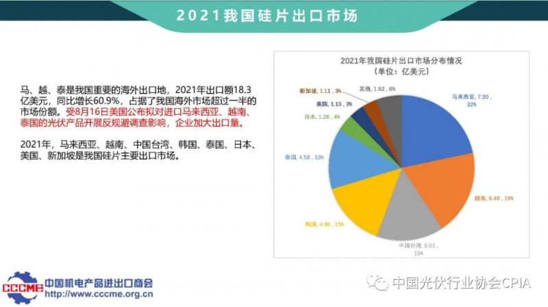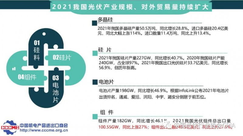 中國機電產品進出口商會光伏分會秘書長張森介紹光伏產品國際貿易情況。2021年我國光伏產業規模、對外貿易量持續擴大,行業發展主要痛點是光伏貿易摩擦再次升級、海運費和匯率大幅上漲等。