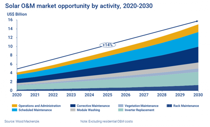 伍德麥肯茲發(fā)布最新研究報(bào)告Global solar PV operations and maintenance (O&M) economics market report 2021(《2021年全球光伏運(yùn)維市場經(jīng)濟(jì)性研究》,預(yù)計(jì)至2030年,全球非住宅光伏電站的運(yùn)營和維護(hù)(O&M)支出將達(dá)到150億美元,較2020年的水平增加三倍。光伏項(xiàng)目的競標(biāo)價(jià)格日益激烈,加之勞動(dòng)力和供應(yīng)鏈成本上升,運(yùn)維服務(wù)供應(yīng)商或?qū)⒚媾R盈利挑戰(zhàn)。