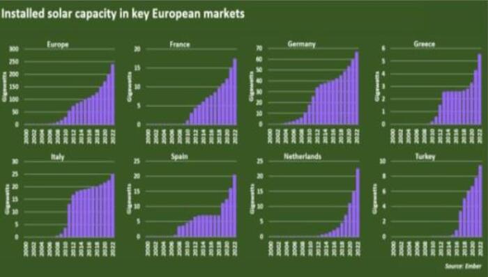 Ember 數(shù)據(jù)顯示,2022 年歐洲整體嵌入式太陽能發(fā)電量,較上年增長近 20%。該地區(qū)所有主要太陽能生產(chǎn)商均實(shí)現(xiàn)兩位數(shù)增長。