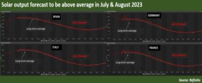 Refinitiv(路孚特,倫敦證券交易所集團(tuán)旗下企業(yè),是全球最大的金融市場數(shù)據(jù)和基礎(chǔ)設(shè)施提供商之一)對國家級太陽能產(chǎn)量的預(yù)測顯示,西班牙、德國、法國和意大利的產(chǎn)量將遠(yuǎn)高于長期平均水平——所有主要太陽能生產(chǎn)國最近幾周都經(jīng)歷了持續(xù)炎熱的天氣。