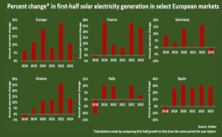 部分歐洲市場上半年太陽能發(fā)電量變化百分比