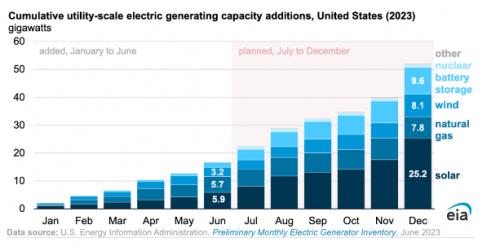 美國開發商計劃在2023年下半年再建設35.2吉瓦的新產能,大部分新增容量是太陽能(55%,即19.3吉瓦),其次是電池存能(7.8吉瓦)和風能(4.9吉瓦)。