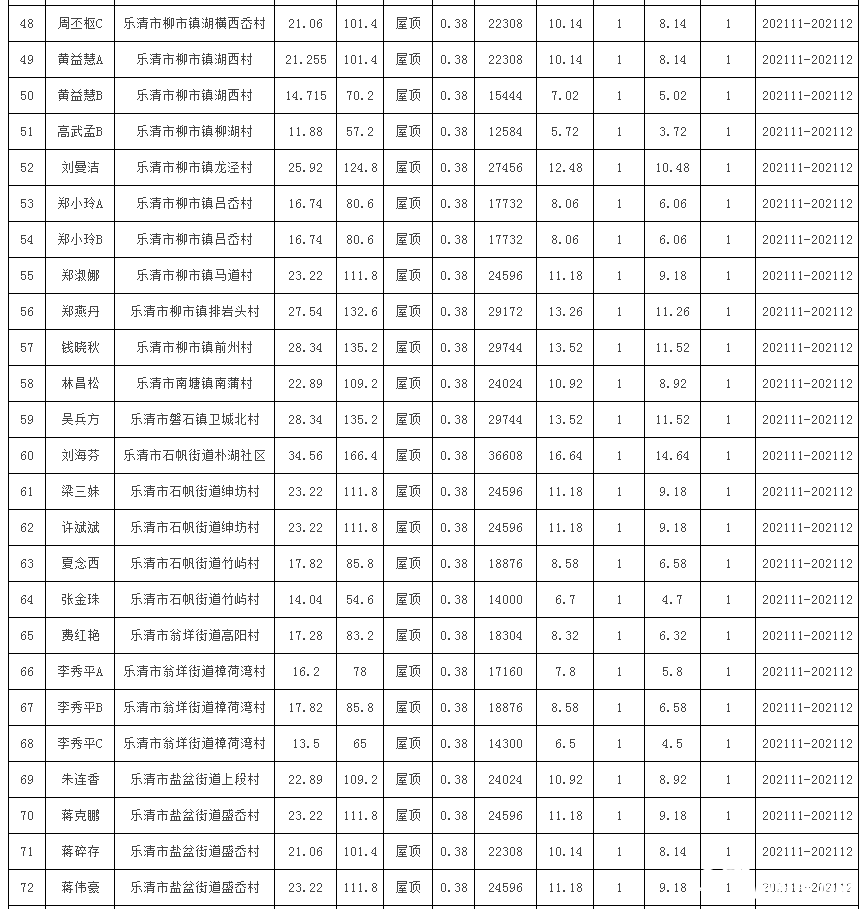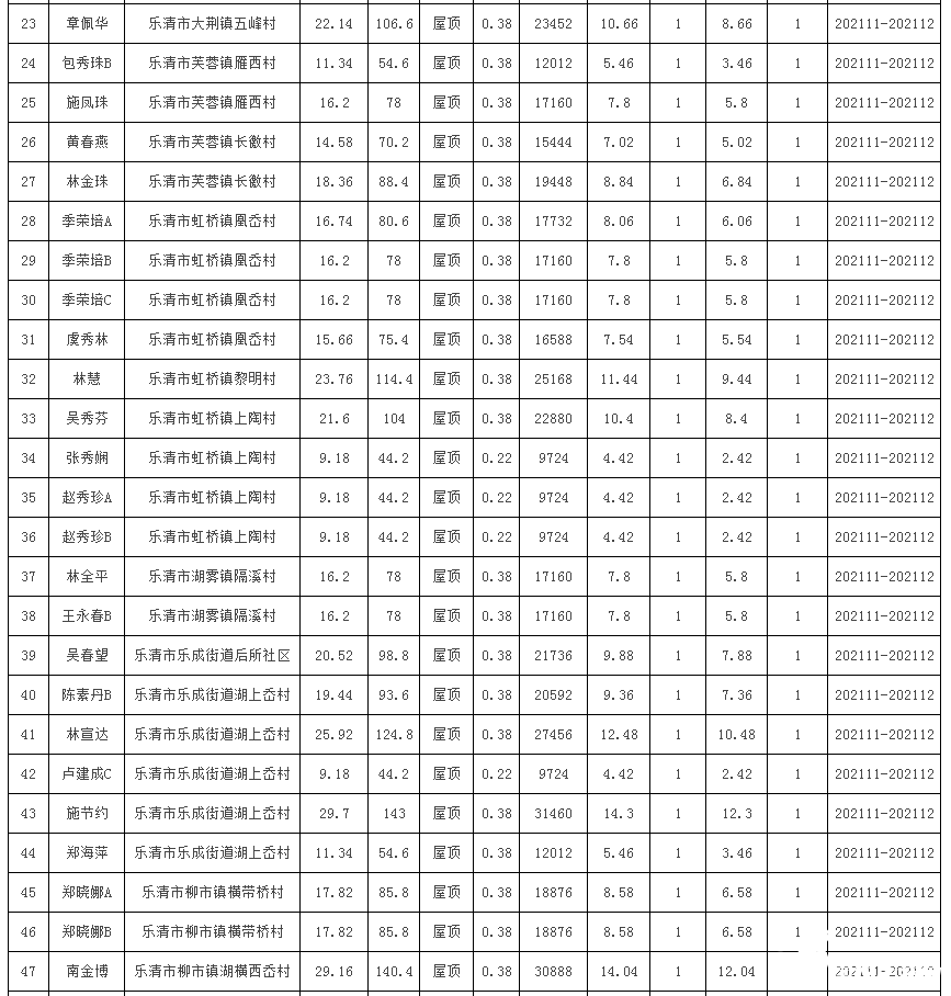 樂清市2021年第二十三批居民家庭屋頂分布式光伏發電項目表