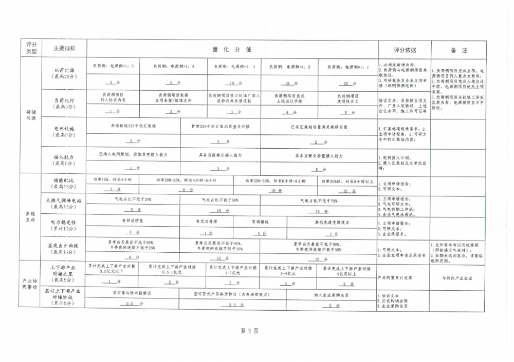 根據文件,其評分內容主要包括企業投資能力、項目前期深度、荷儲網源、多能互補、產業協同帶動、生態治理以及地方經濟貢獻等八大類,各類項目下面細小劃分35個小項。不同類別之間設置不同分值,以總得分計算排序。