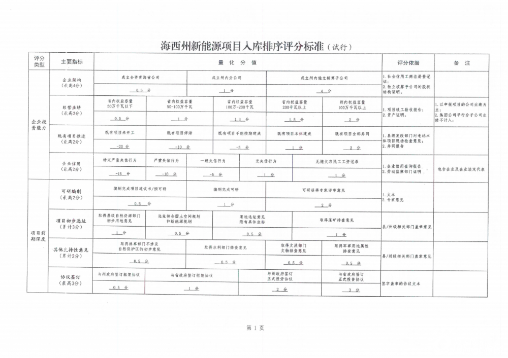 1月19日,青海海西州發改委印發《新能源項目入庫排序評分標準》,通過八大類35小項的評分類型對新能源項目進行評分排序。
