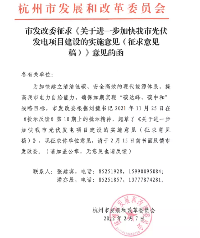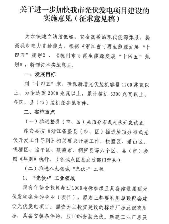 近日,杭州市發改委發布了一則關于征求《關于進一步加快我市光伏發電建設的實施意見(征求意見稿)》意見的函。