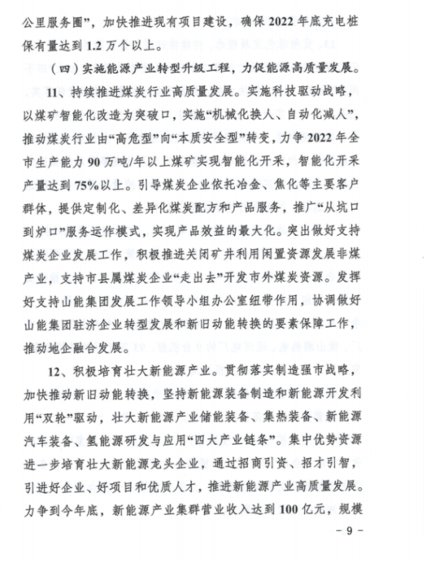 2、能源生產方面:(1)按照現行政策不變的情況下,2022年內全市煤炭產量穩定在5200萬噸左右;各類發電企業完成發電量490億千瓦時左右;(2)貫徹落實國家及省市煤電裝機相關政策,穩步實施“上大壓小”,2022年煤電裝機容量穩定在1050萬千瓦左右;(3)立足濟寧市資源稟賦實際,加快新能源開發利用和消納能力提升,力爭2022年底新能源總裝機實現350萬千瓦,新能源發電量完成45億千瓦時。