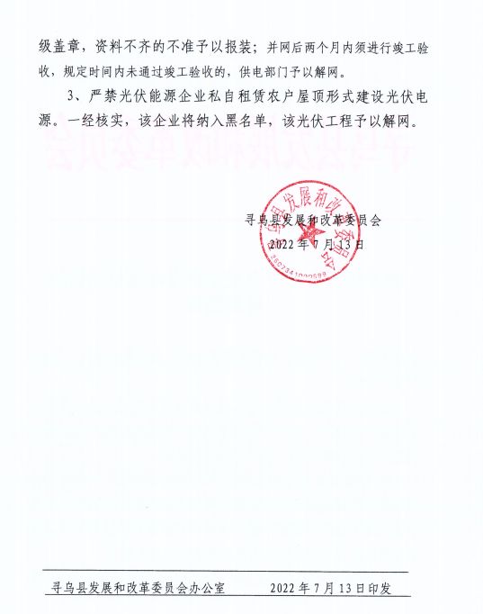 近日,江西省贛州市尋烏縣發改委印發《關于規范戶用分布式光伏發電項目建設的補充通知》,通知明確提出嚴禁光伏能源企業私自租賃農戶屋頂形式建設光伏電源。一經核實,該企業將納入黑名單,該光伏工程予以解網。