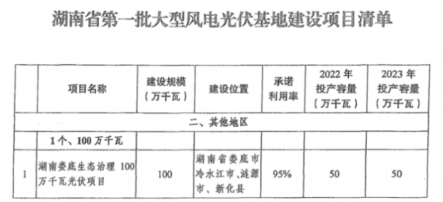 第一批風(fēng)光大基地名單中的另一項(xiàng)目,湖南婁底生態(tài)治理100萬(wàn)千瓦光伏項(xiàng)目,首批500MW將于2022年10月30日前并網(wǎng)。