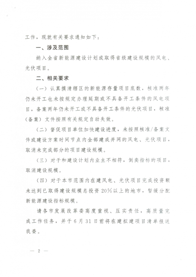 督促項目單位加快建設(shè)進度,未按照核準(zhǔn)/備案文件或建設(shè)方案時間節(jié)點內(nèi)全部建成并網(wǎng)的風(fēng)電、光伏項目,取消未完成部分的項目建設(shè)規(guī)模。