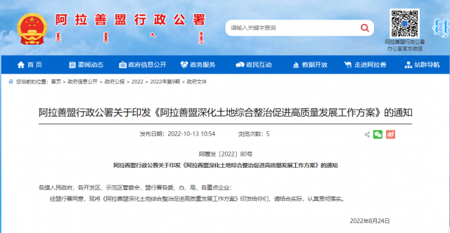 10月13日,阿拉善盟行政公署官方網站發布“關于印發《阿拉善盟深化土地綜合整治促進高質量發展工作方案》的通知”。