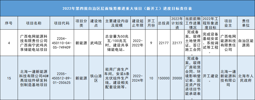 11月1日廣西壯族自治區(qū)重大項目建設(shè)推進(jìn)領(lǐng)導(dǎo)小組辦公室印發(fā)2022年第四批自治區(qū)層面統(tǒng)籌推進(jìn)重大項目方案的通知。其中,8個風(fēng)光項目進(jìn)入2022年第四批自治區(qū)層面統(tǒng)籌推進(jìn)重大項目(預(yù)備)進(jìn)度目標(biāo)責(zé)任表;2個光伏等新能源項目進(jìn)入2022年第四批自治區(qū)層面統(tǒng)籌推進(jìn)重大項目(新開工)進(jìn)度目標(biāo)責(zé)任表。