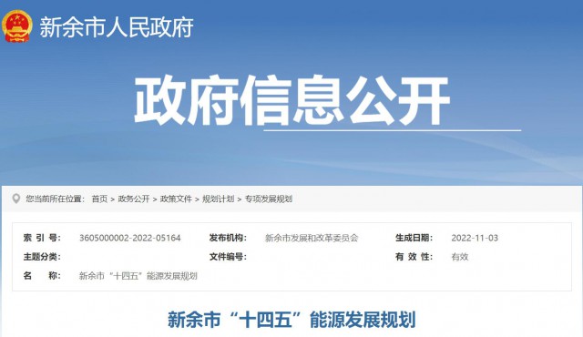 11月3日,江西省新余市發布“十四五”能源發展規劃。規劃指出,加大新能源開發利用力度,有序推進風電開發,大力推進光伏開發,因地制宜推動生物質和城鎮生活垃圾發電發展,2025年市內風電、光伏、生物質發電裝機容量分別達到30、150、5萬千瓦以上。