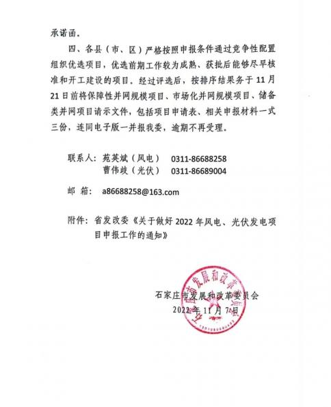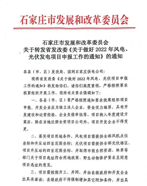 11月7日,河北省石家莊市發改委印發《關于做好2022年風電、光伏發電項目申報工作的通知》,要求項目需按期開工、并網,并由縣級政府和開發企業出具承諾函;縣級政府不得強制增加其它附加條件,并出具承諾函。